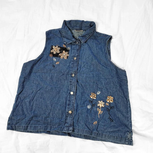 90s Vintage Denim Waistcoat Vest with Floral Embroidery